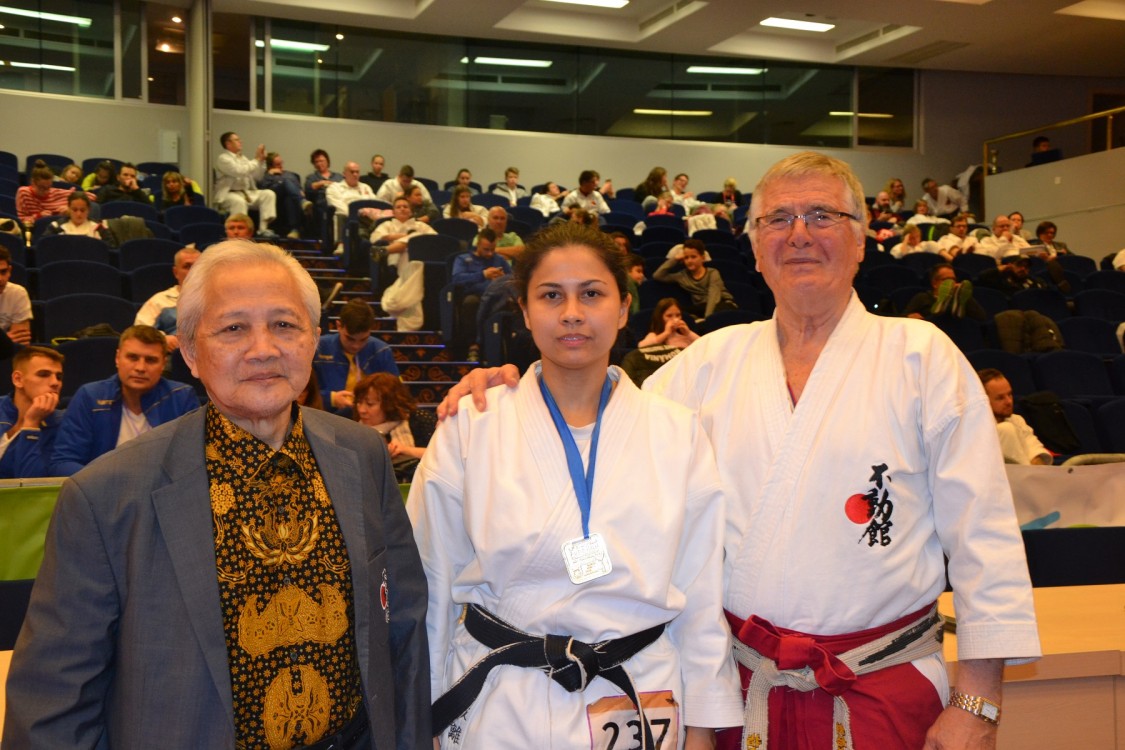Diana Soebajová - 1.místo fukugo ženy Fudokan Karate, společné foto s trenérem a Dr.Ilijou Jorgou, prezidendem WFF