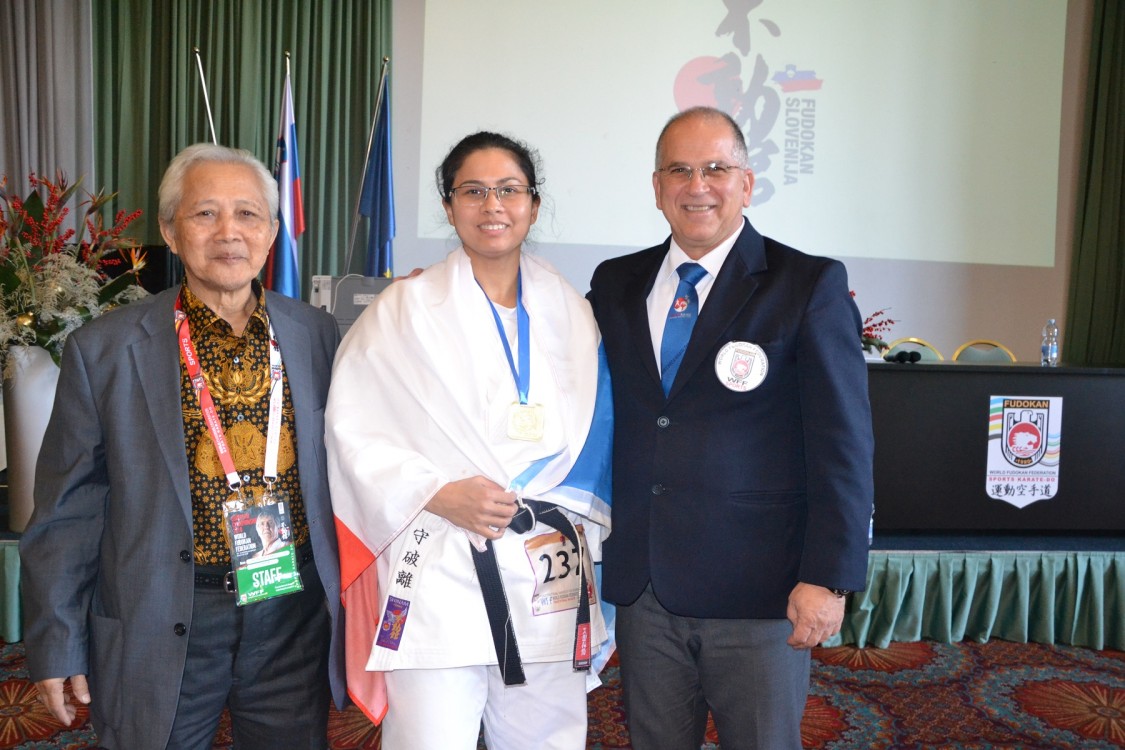 Diana Soebajová, 1.místo kata Sport Karate, společné foto s trenérem a Mr.Carlos Rodrigues Dias, General secretary WFF Sport